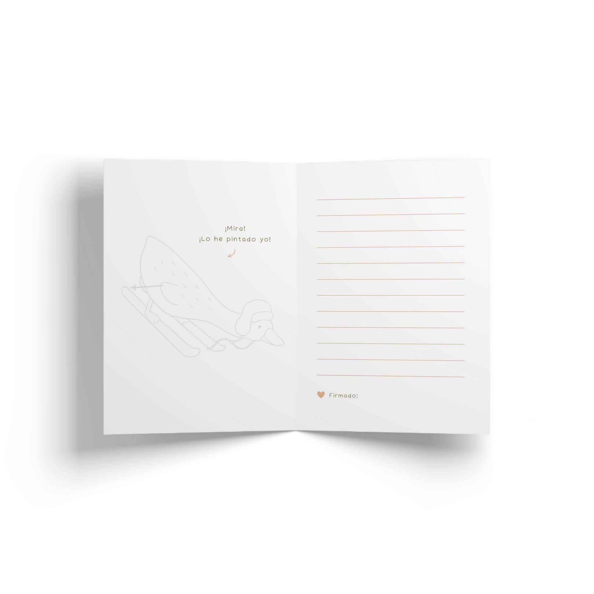 Una felicitación navideña ilustrada con una graciosa oca esquiadora, pensada para que los peques también participen en la magia. Incluye una palabra punteada para repasar y un interior para colorear. ❤️